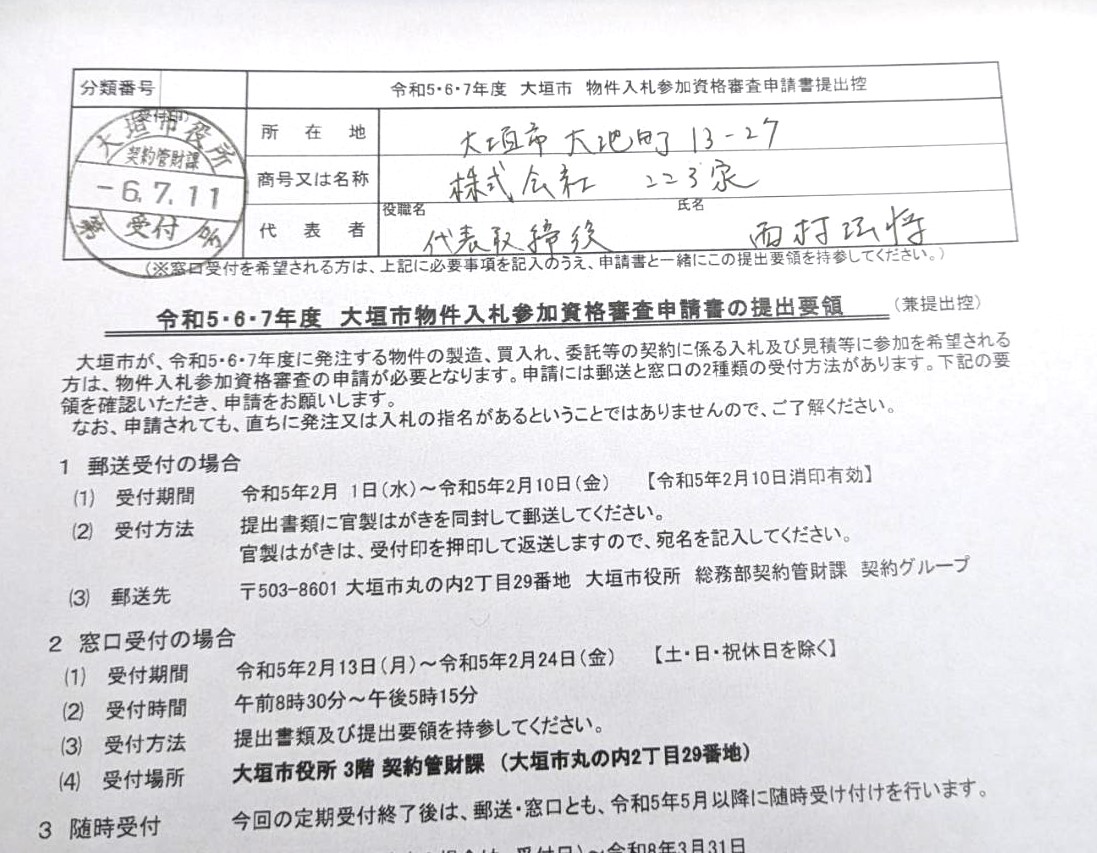 本日は私の経営する会社の大垣市の令和5・6・7年度の大垣市物件入札参加資格申請をしてきました。